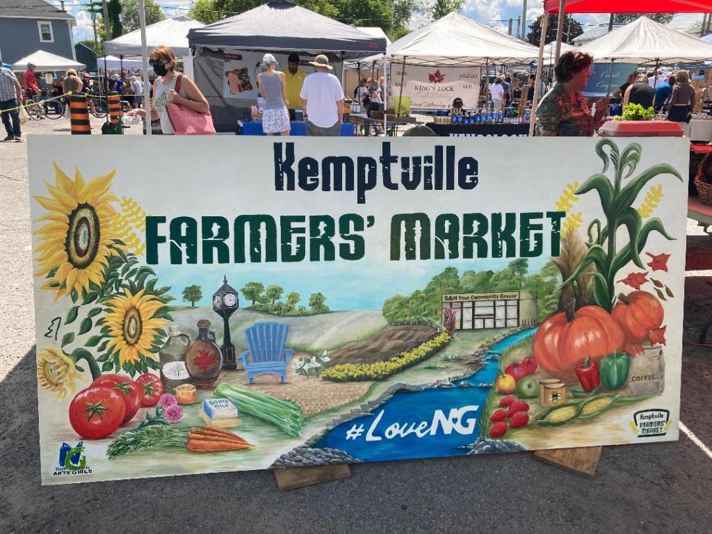 The NGAG became involved in the KFM’s bid to have a permanent, easily recognizable, and representative design for the Market. They put out a bid for drawings and chose the original sketch by Guild member Johanna Jansen. When execution became necessary, the NGAG took on the task. Volunteers were assembled and a lead artist was chosen. Caroline Marshall, an experienced sign and scenery painter, whose former work was seen many times as backdrops, etc. for the old Kemptville Players, stepped up. Caroline, Tammy Keith, Tabitha Valliant, Leahbeth Harding and Johanna became the force behind the large, colourful mural recently unveiled at the KFM.